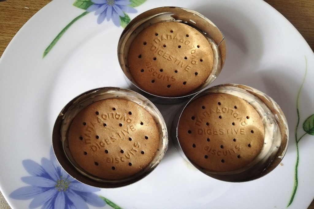 • Em um prato, posicione os três cortadores e, dentro deles, coloque um biscoito Digestive.