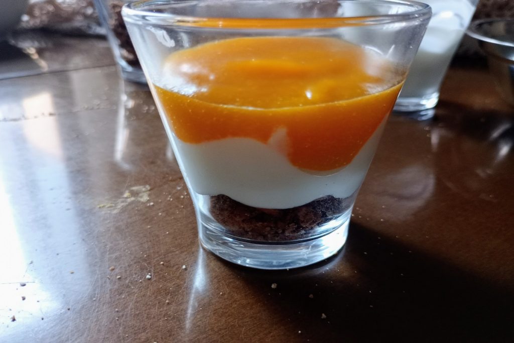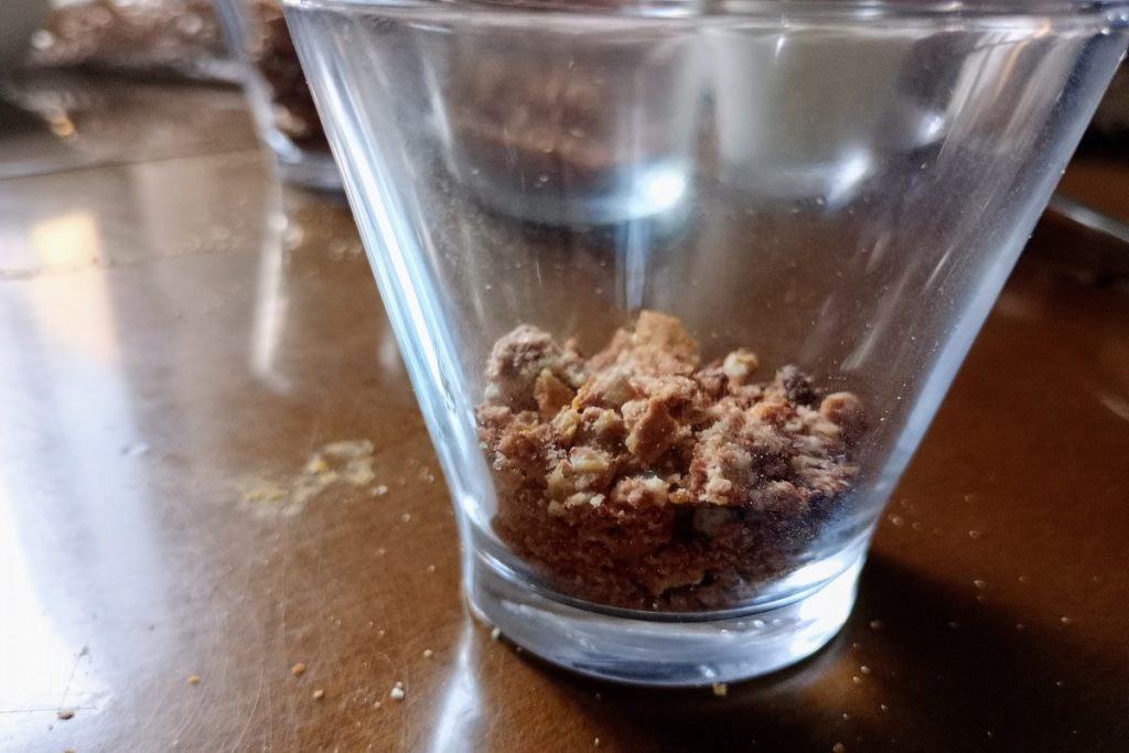 Esfarelamos os biscoitos e colocamos um pouco no fundo do copinho.