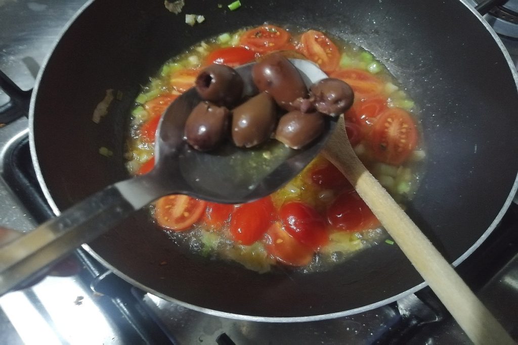 Continuamos com a adição das azeitonas pretas, deixamos cozinhar por 5 minutos e depois terminamos com os filés de cavala.