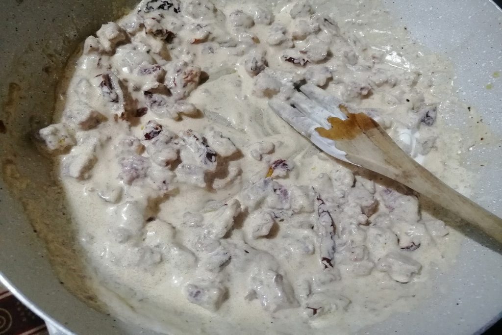 Adicione o creme de leite e misture, cozinhe as fettuccine e misture no molho.