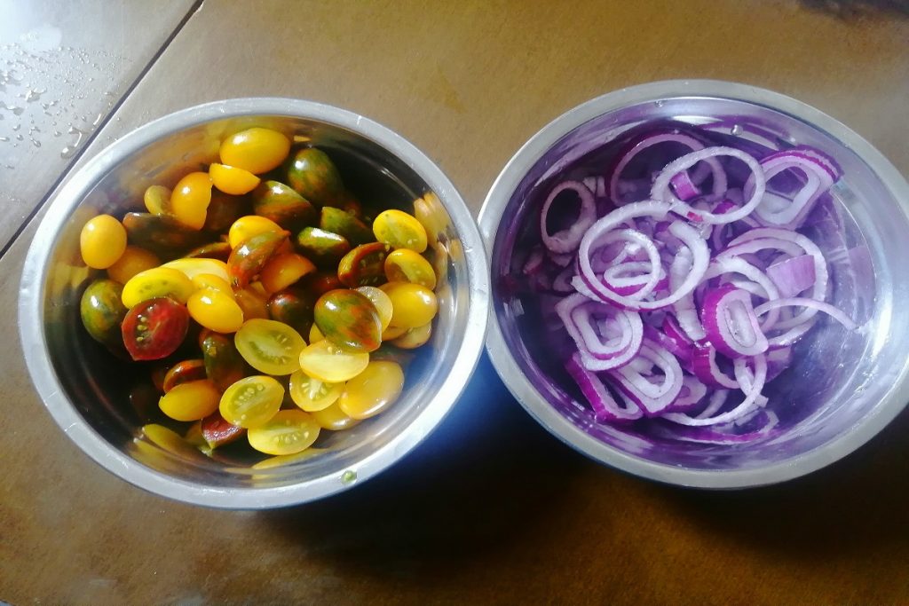 Lavamos e cortamos ao meio os dois tipos de tomate-cereja.