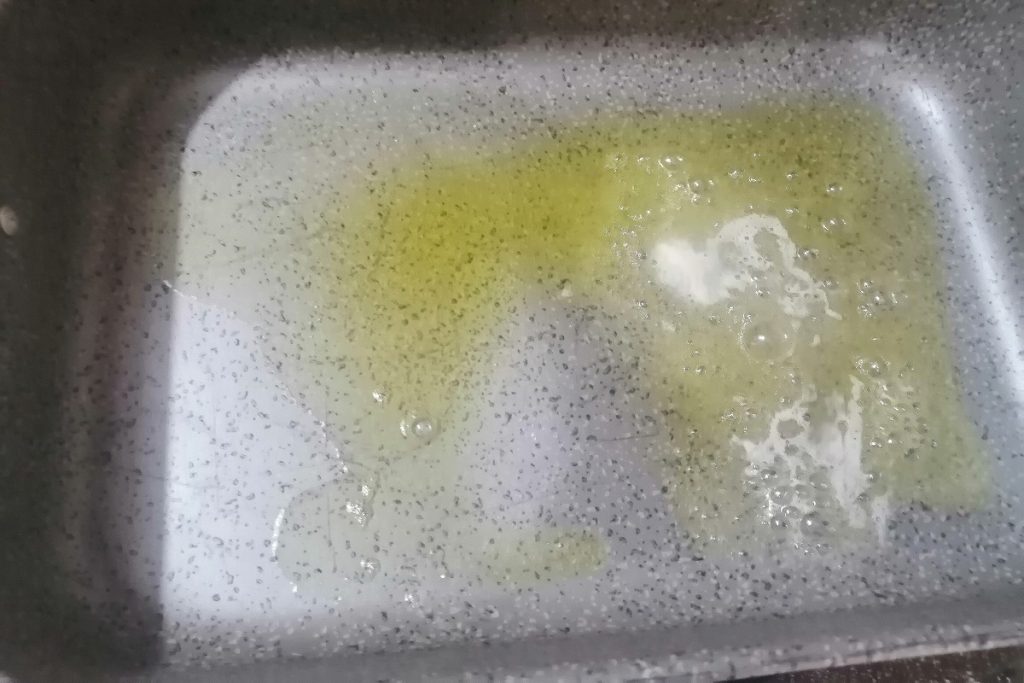 Pegamos uma assadeira, colocamos no fogo e adicionamos um pouco de azeite de oliva EVO e o pedaço de manteiga, deixamos derreter em fogo baixo.