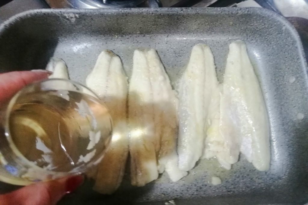 Colocamos os filetes de robalo temperados com sal e levemente enfarinhados.