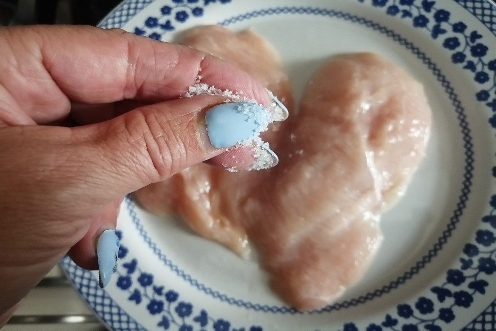 Temperamos o peito de frango com sal e polvilhamos com cúrcuma em ambos os lados.