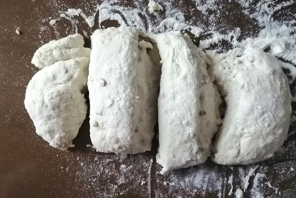 Dividimos em 4 porções dando uma forma oval, deixamos crescer em uma assadeira forrada com papel manteiga por 3-4 horas no forno com a luz acesa.