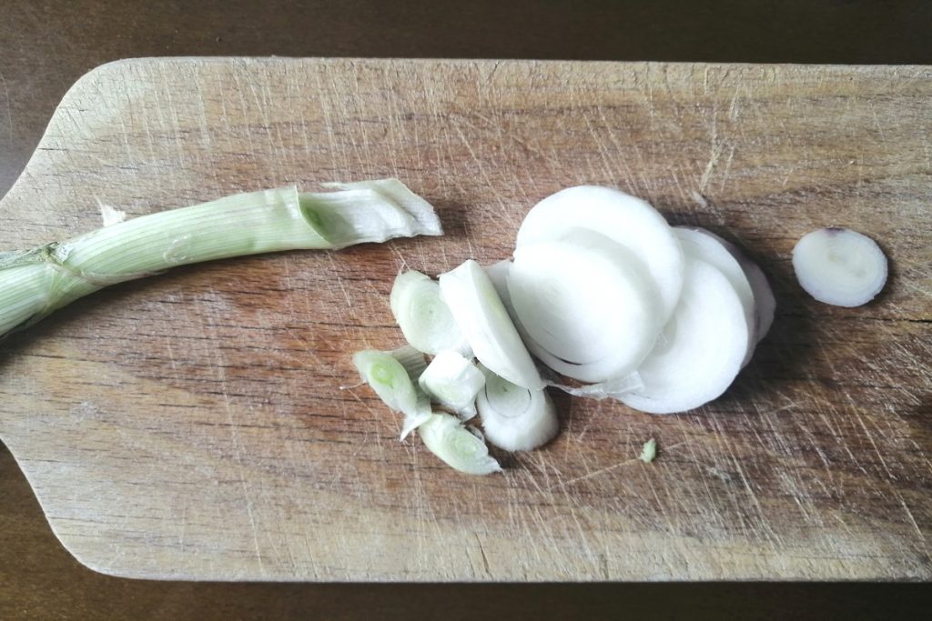 Uma vez que os vegetais estejam limpos, prossiga fatiando a cebolinha fresca em rodelas, separe o máximo possível os anéis e passe a murchar a cebolinha em uma frigideira com azeite EVO.