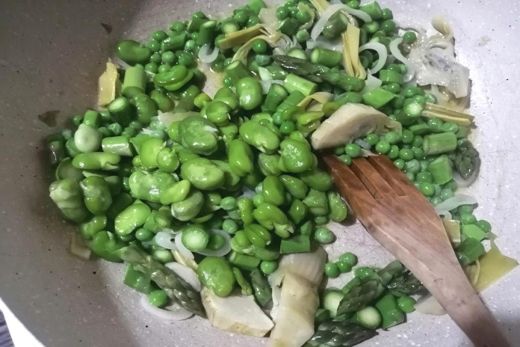 A vignarola é uma receita típica do Lazio que contém os vegetais da primavera: ervilhas, favas, alcachofras tardias, cebolinhas, eu também adicionei os aspargos.