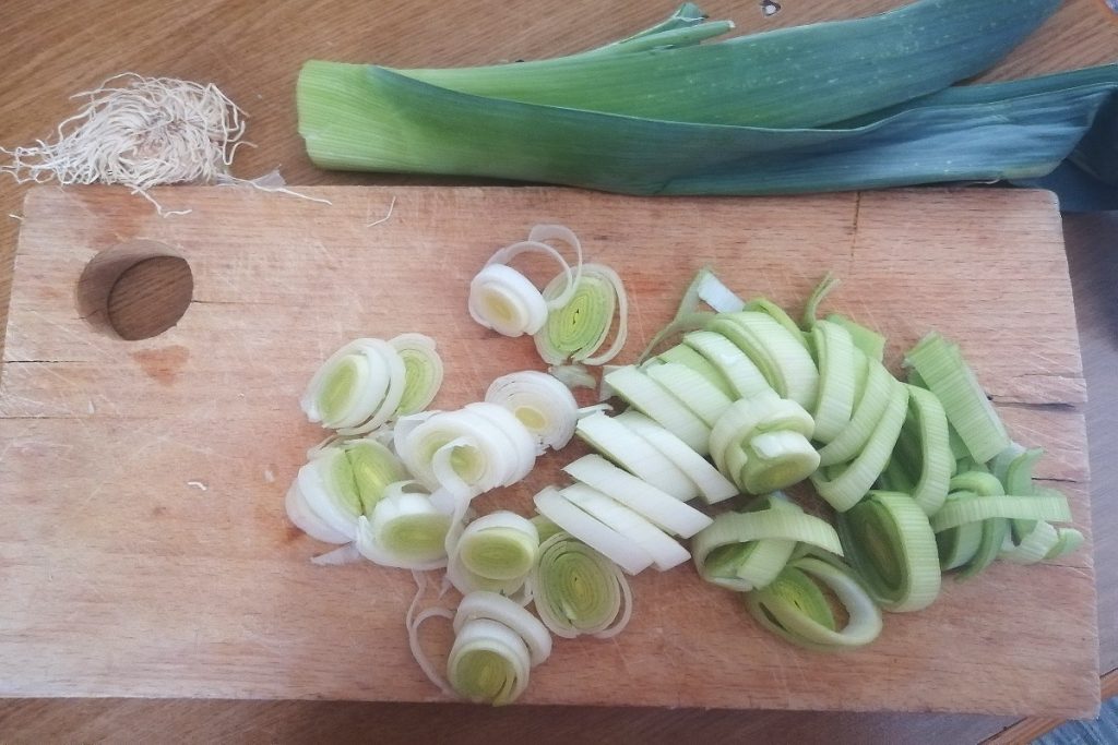 Em uma panela, despeje o azeite EVO e o alho-poró fatiado