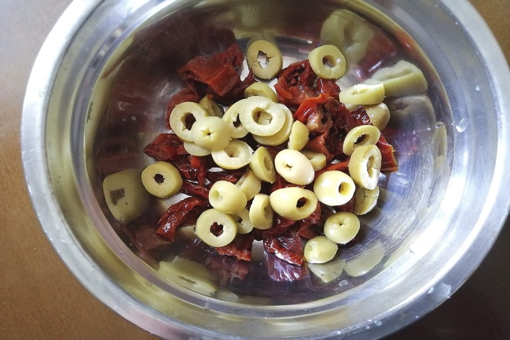• Comece escorrendo os tomates secos e cortando-os em pedaços pequenos, adicione as azeitonas sem caroço cortadas em rodelas.