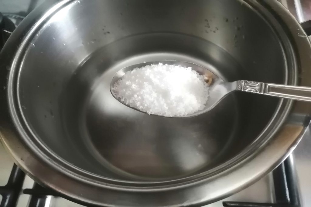 Coloque a água para a polenta em uma panela e adicione uma colher rasa de sal fino.