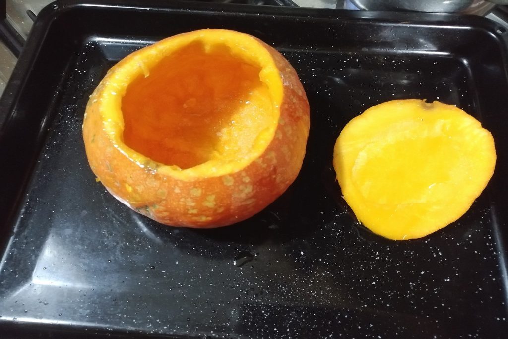 Transfira para dentro da abóbora e leve novamente ao forno a 220º por mais 15 minutos.