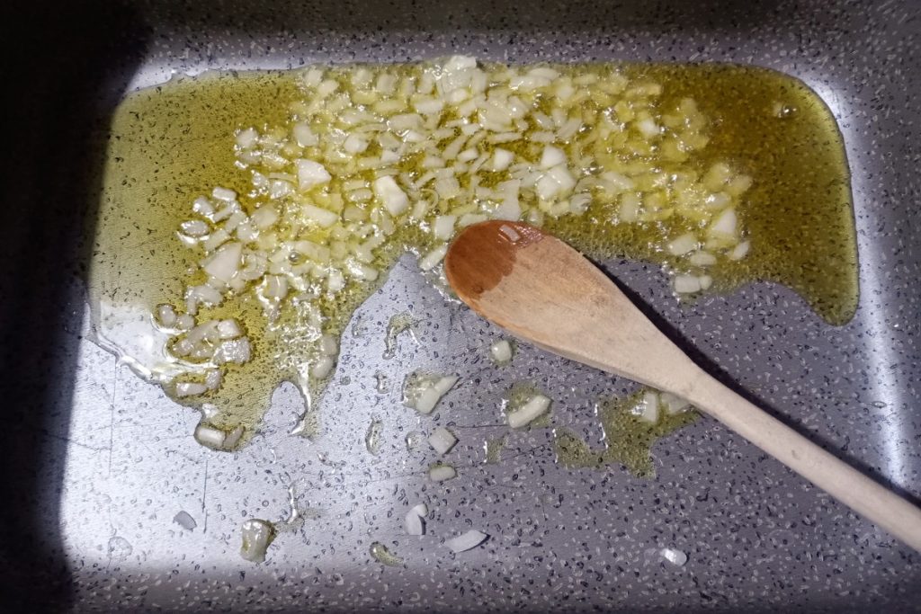 Em uma panela, colocamos o azeite EVO e a cebola picada finamente, douramos em fogo baixo.