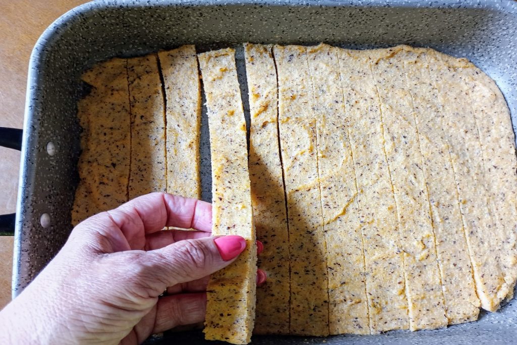 • Retome a polenta e corte em tiras de cerca de 2 cm e depois em palitos de 4-5 cm.
