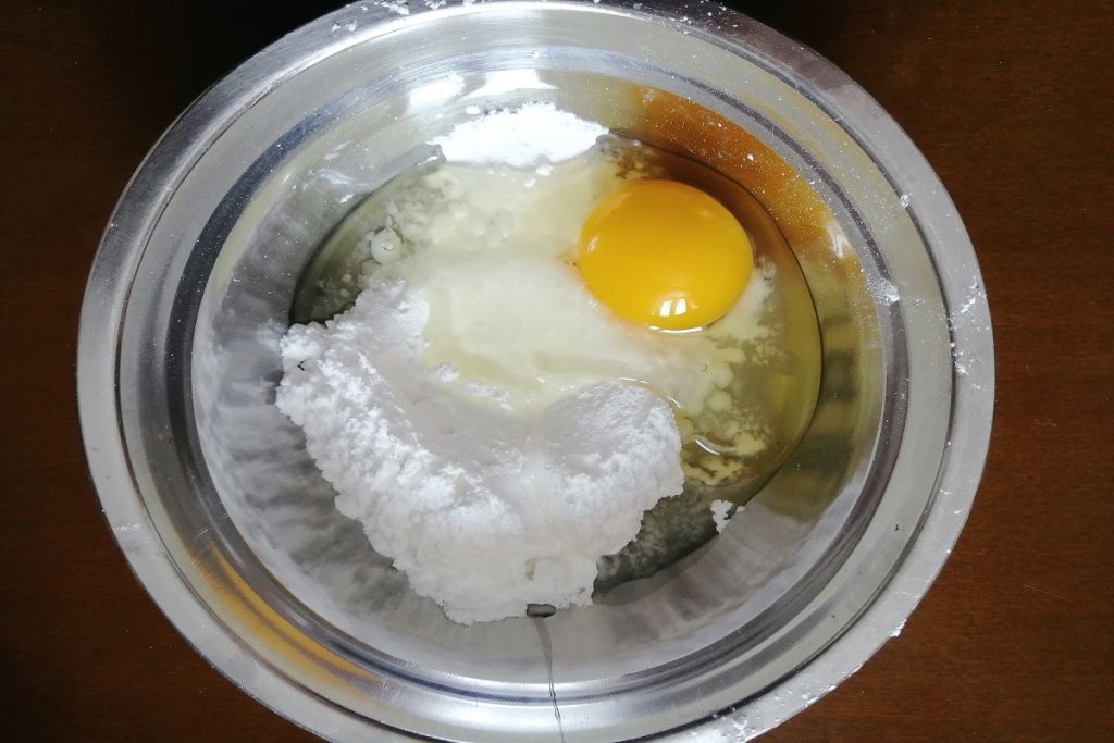 Em outra tigela, adicionamos o ovo e o açúcar, misturamos com um batedor manual.
