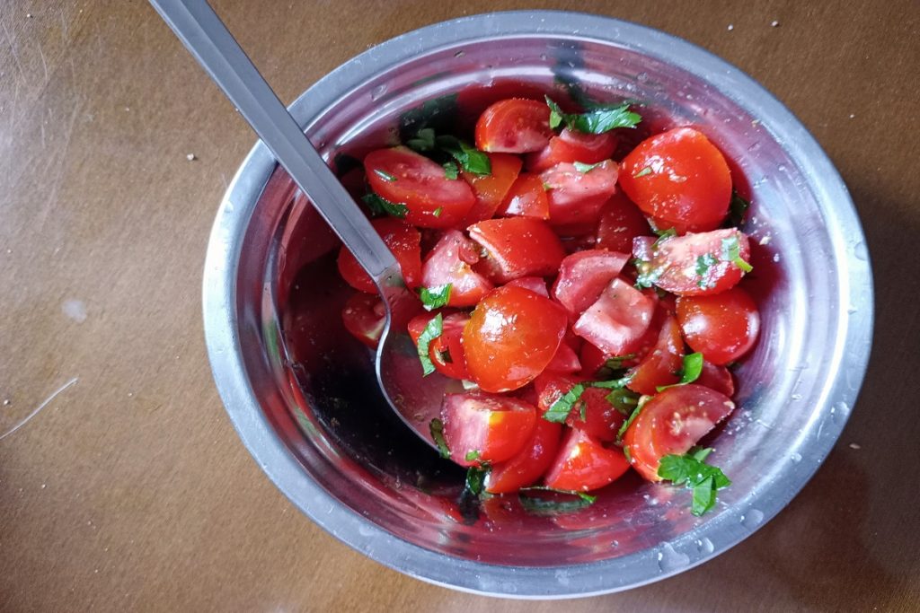• Para preparar a receita, é preciso lavar e cortar os tomatinhos em quatro pedaços e temperá-los com: sal, azeite de oliva extra virgem, orégano e salsinha.