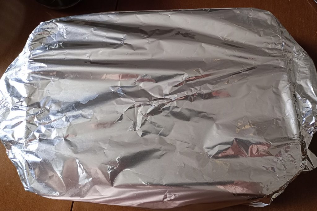 • Cubra a assadeira com papel alumínio e coloque no forno a 220º por 30 minutos. Nos últimos 10 minutos de cozimento, retire o papel alumínio.