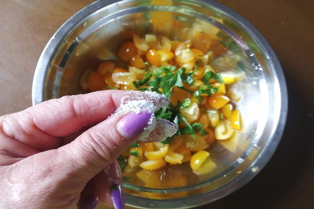 Temperamos os tomatinhos com sal, azeite EVO e misturamos.