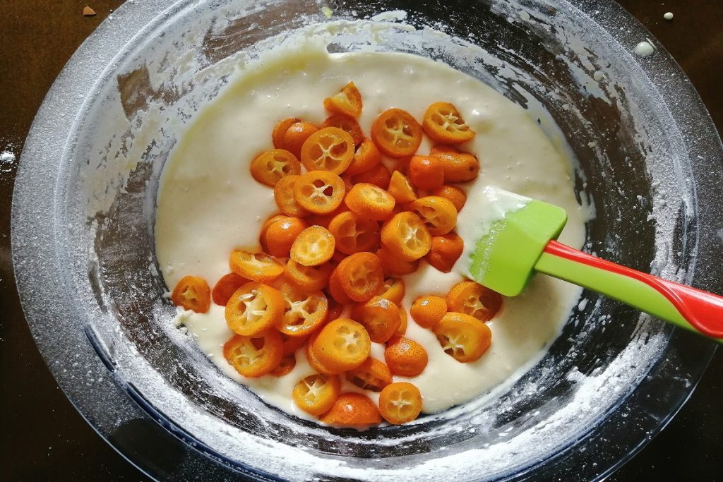 Incorporamos os kumquats e as gotas de chocolate, misturamos.
