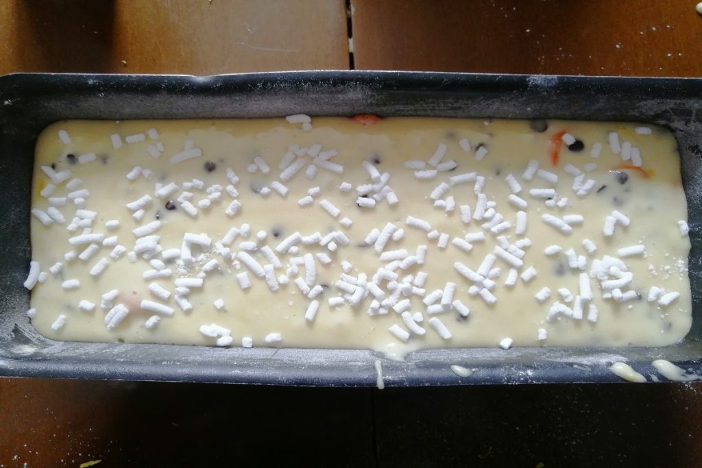Colocamos a massa na forma de plumcake untada e enfarinhada, polvilhamos com granulado de açúcar.