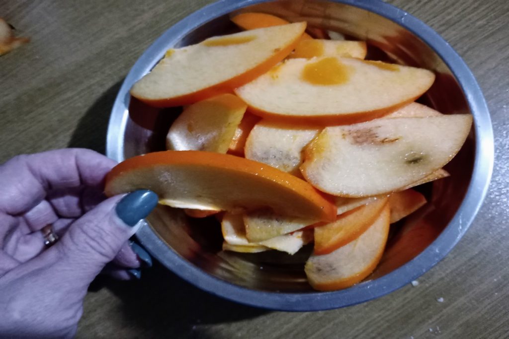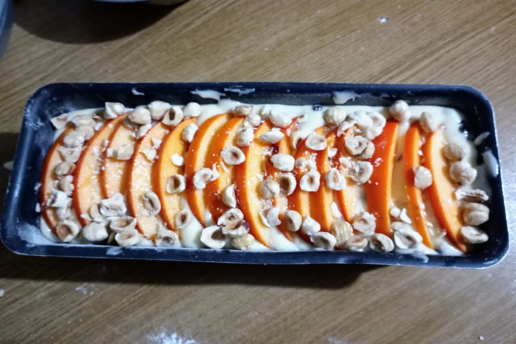 Colocamos sobre a massa uma parte das fatias de caqui.