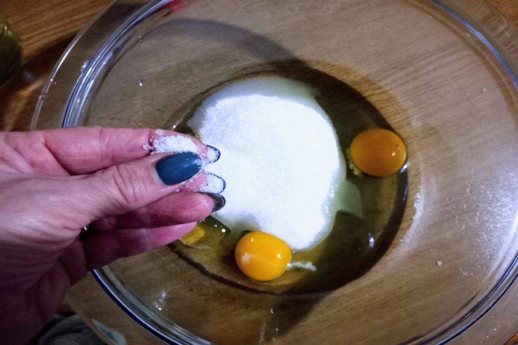 Adicionamos os ovos quebrados, o açúcar e a pitada de sal, batemos com a batedeira elétrica por alguns minutos.