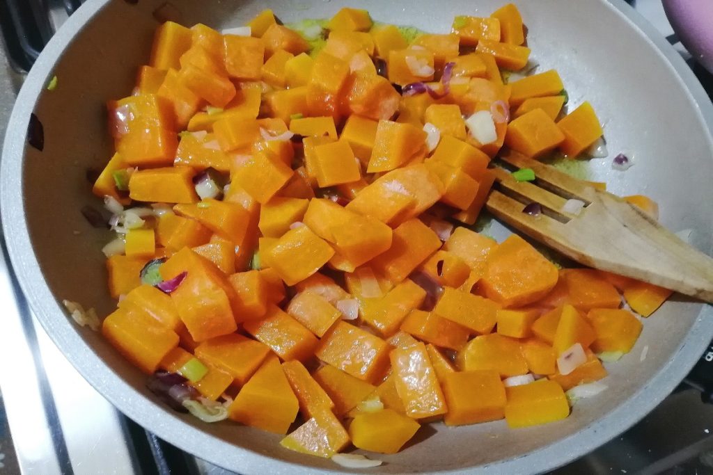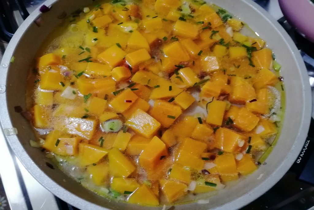 Adicionamos a abóbora limpa e cortada em cubos, acrescentamos a cebolinha fresca cortada finamente.