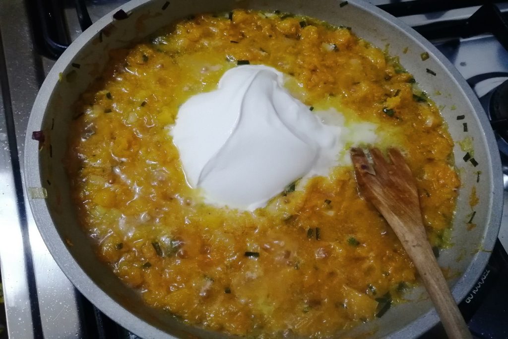 No final do cozimento, você obterá um creme de abóbora, incorpore o creme de leite, misture e desligue.