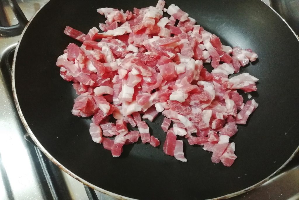 Em uma frigideira antiaderente, coloque o bacon defumado e deixe dourar.
