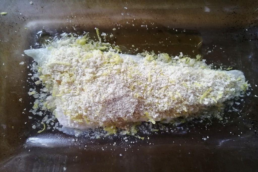 O robalo ao limão com pinoli é um prato leve de peixe, perfumado com uma crosta dourada de pão.