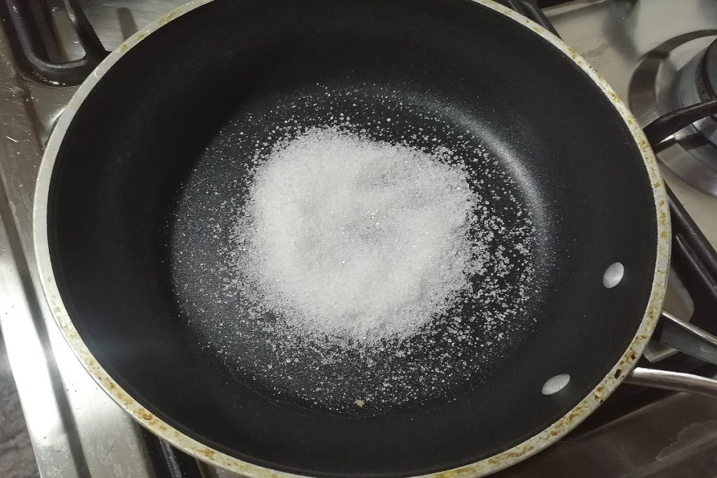 Coloque uma frigideira no fogo com o açúcar e adicione as frutas vermelhas congeladas.