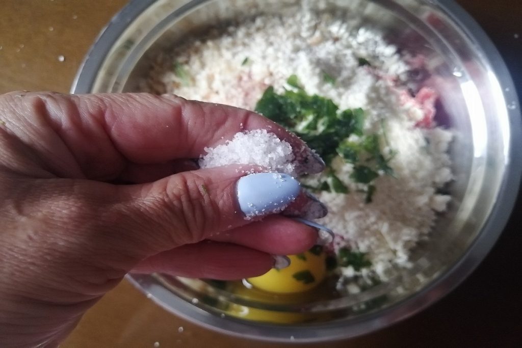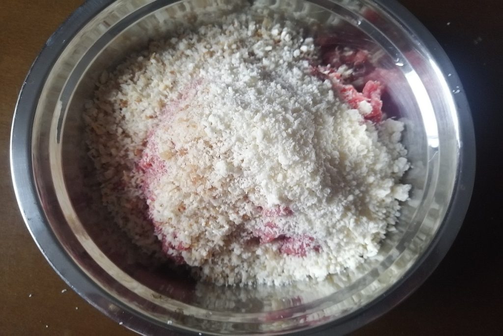 Coloque em uma tigela a carne moída de vitela e adicione: o miolo de pão, o queijo grana ralado, a salsinha, o ovo.