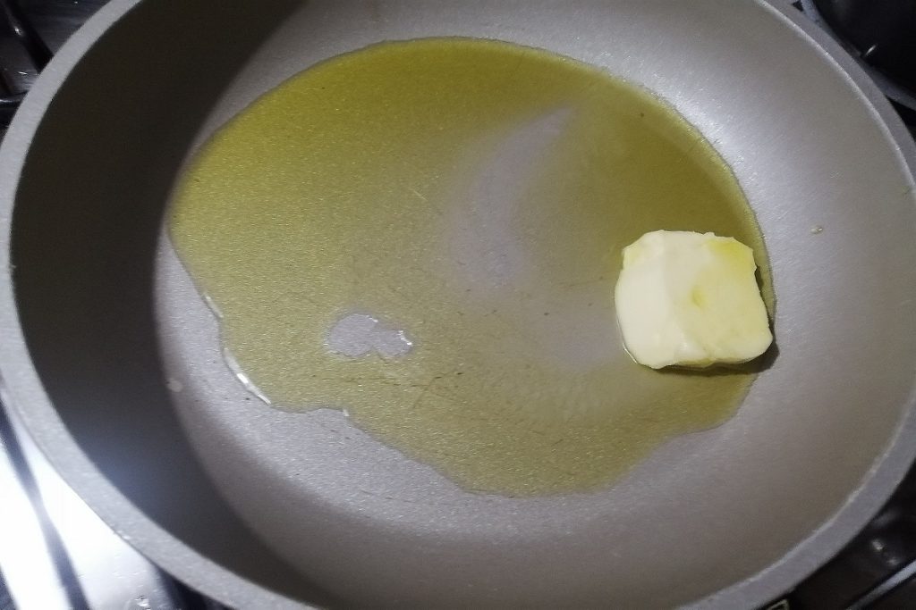 Em uma panela, coloque um pouco de azeite e a manteiga, deixe aquecer em fogo baixo.