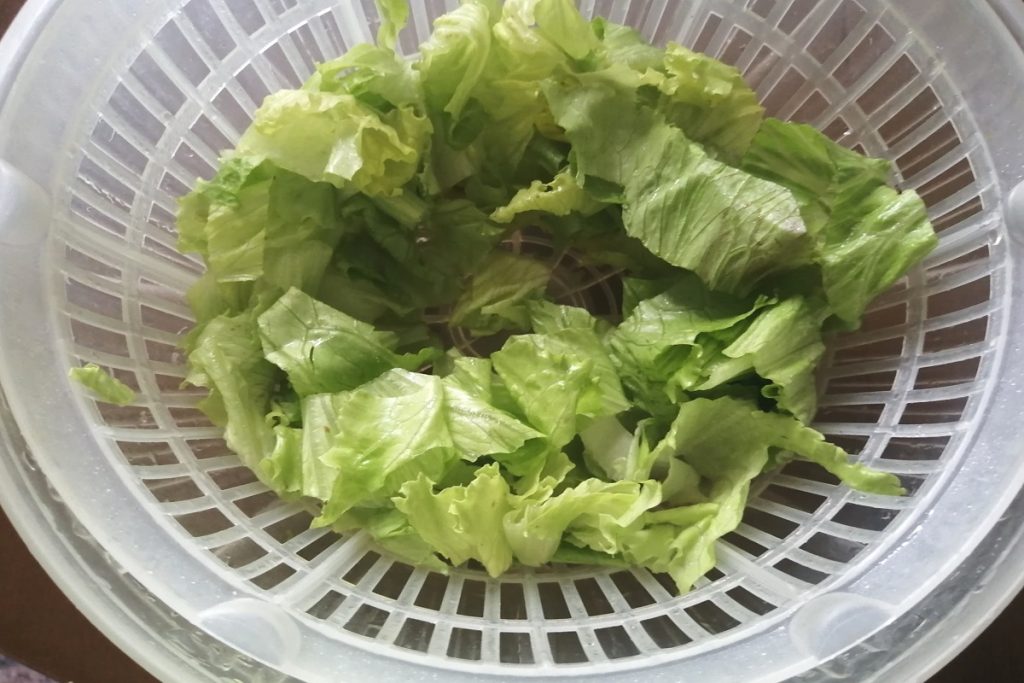 Lavamos a alface e cortamos para depois passar na centrífuga para eliminar o excesso de água.