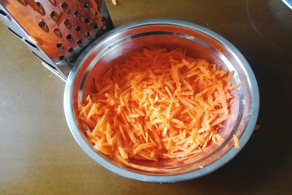 Descascamos as cenouras e ralamos em julienne com um ralador multiuso, adicionamos às cenouras a rúcula lavada e picada.