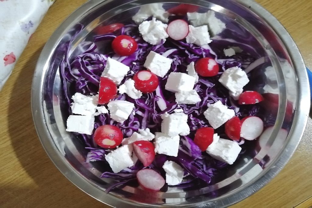 • Cortamos o queijo feta em cubos e adicionamos ao repolho roxo.