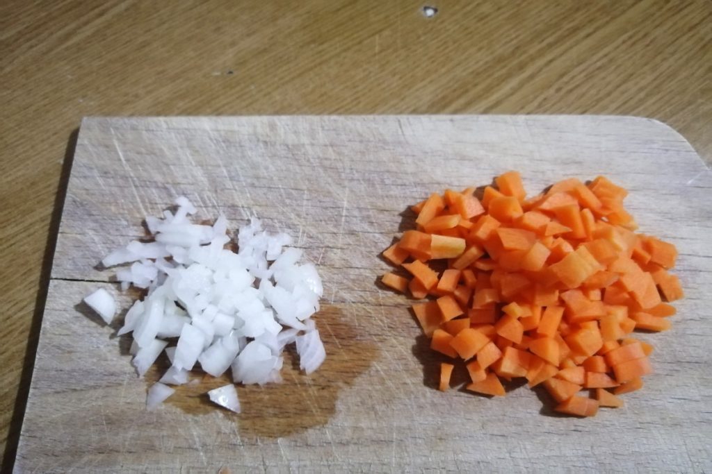 • Limpe e corte em pequenos pedaços a cebola e a cenoura.