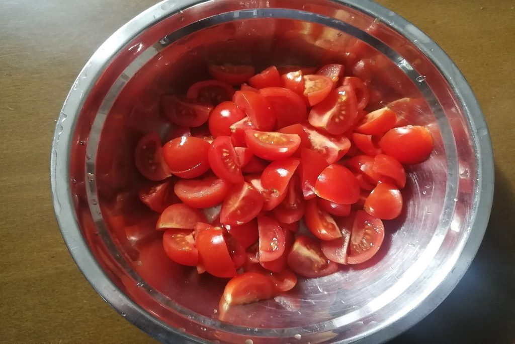 • Lave os tomatinhos e corte-os em 4.