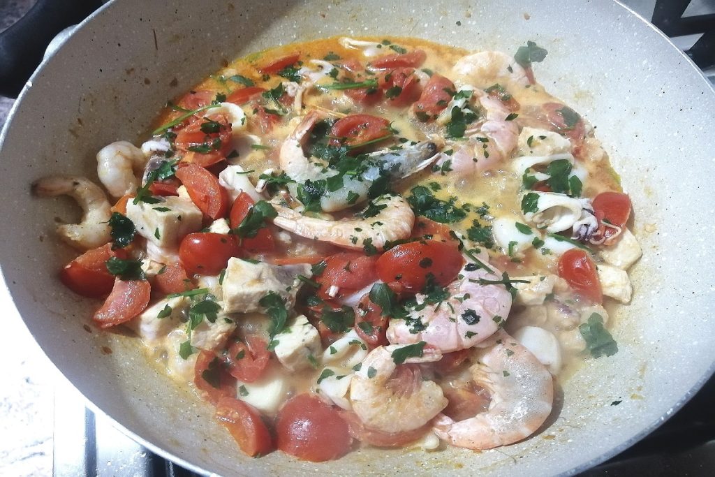 A mistura é composta por lulinhas, polvinhos, lulas, chocos, camarões e pedacinhos de merluza; eu acrescentei uma fatia de peixe-espada cortada em cubinhos.