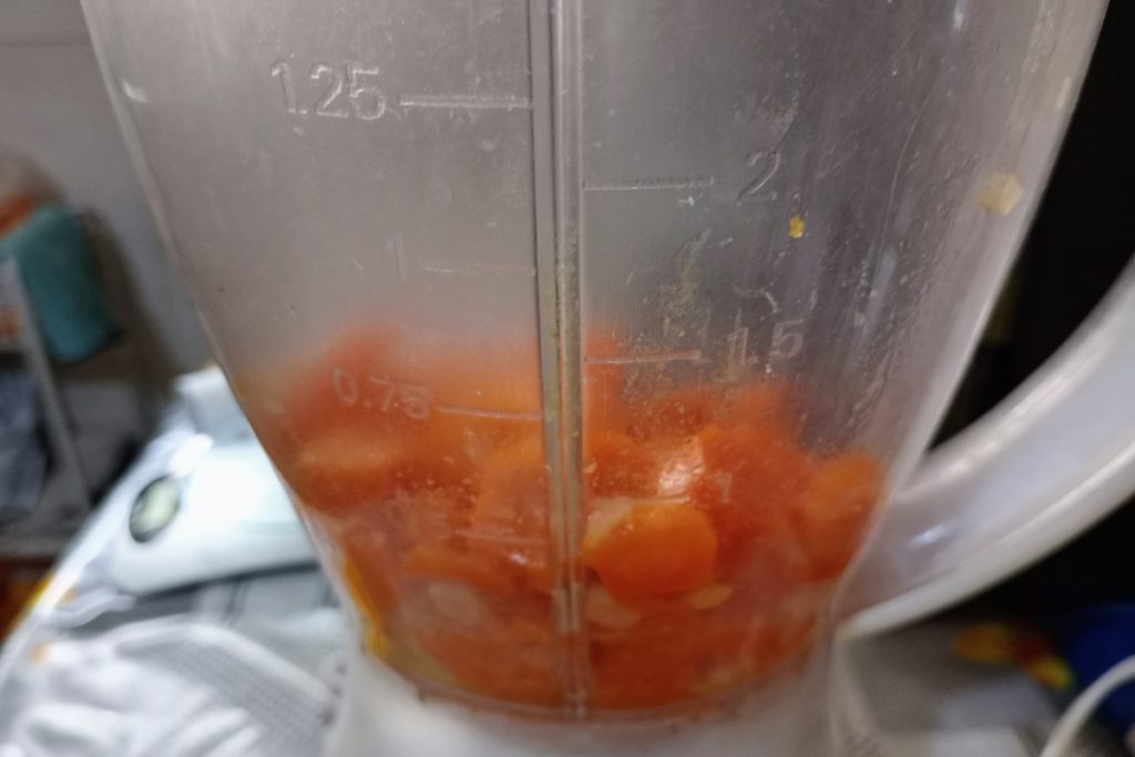• Assim que o cozimento estiver completo, despeje as cenouras no copo do liquidificador e bata.