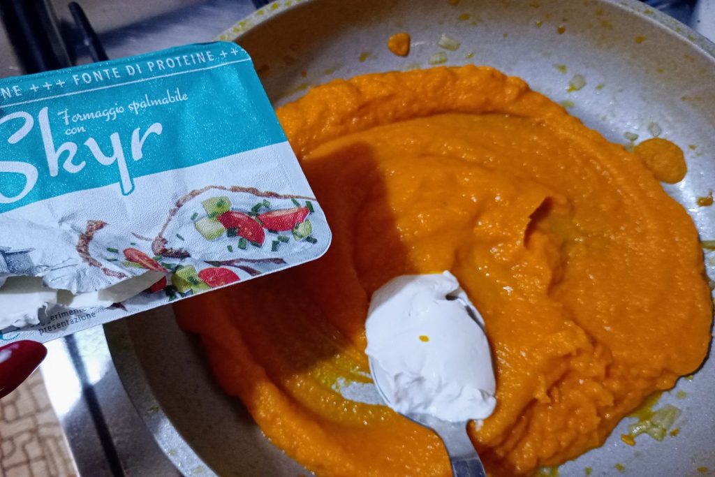 • Coloque o purê de cenouras de volta na frigideira e adicione as duas colheres de queijo skyr, ligue o gás e deixe o queijo derreter.