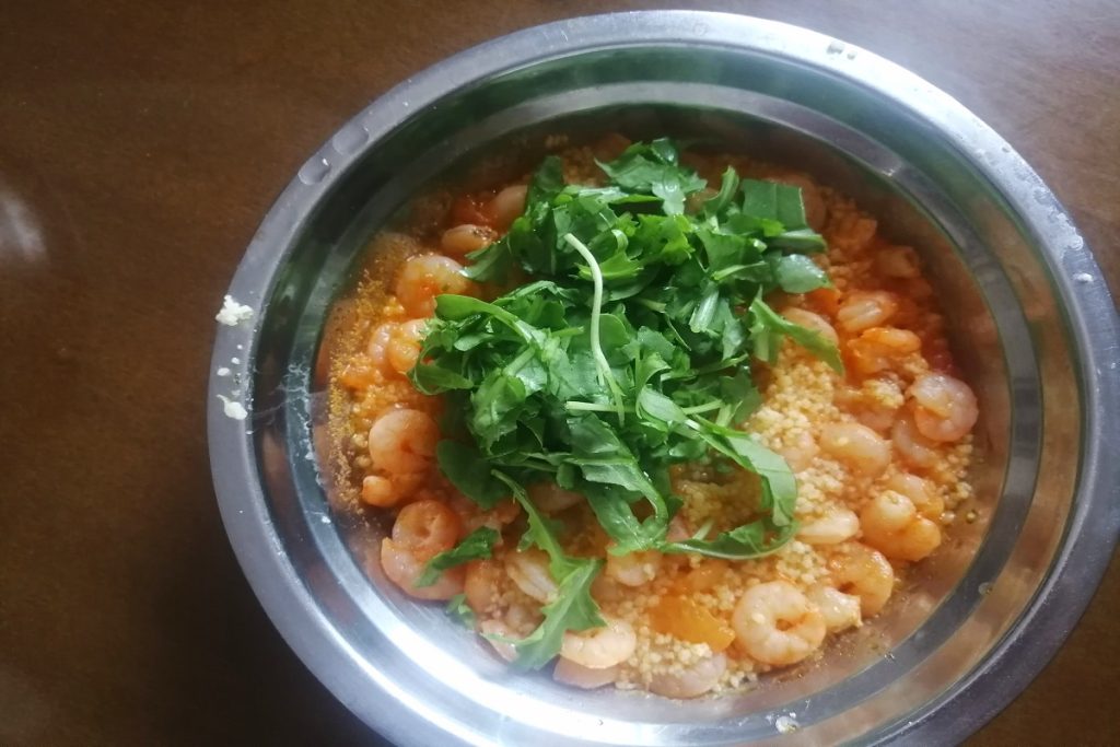 Despejamos os camarões mornos no cuscuz. O caldinho deve cobri-lo, se necessário, adicione um pouco de água morna.