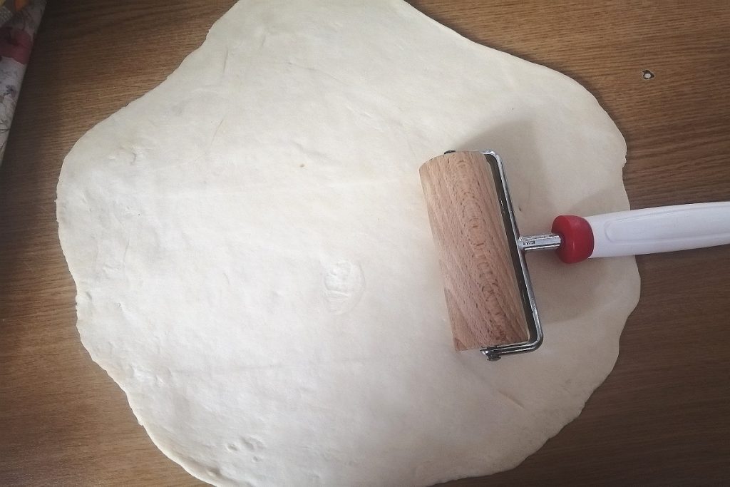 Dividimos a massa em duas partes e estendemos com um rolo.