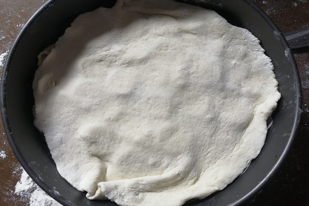 Cobrimos com o outro disco de massa, selamos as bordas e perfuramos com um garfo.
