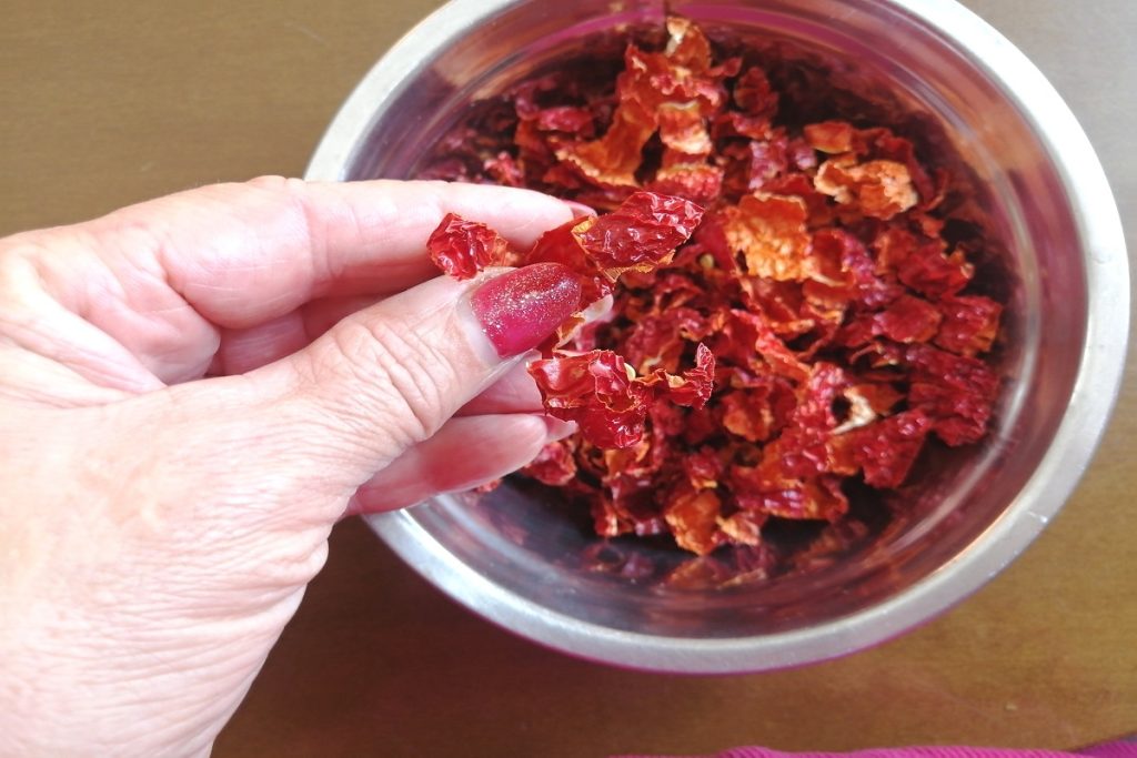 Cortamos os pimentões cruschi em pequenos pedaços.