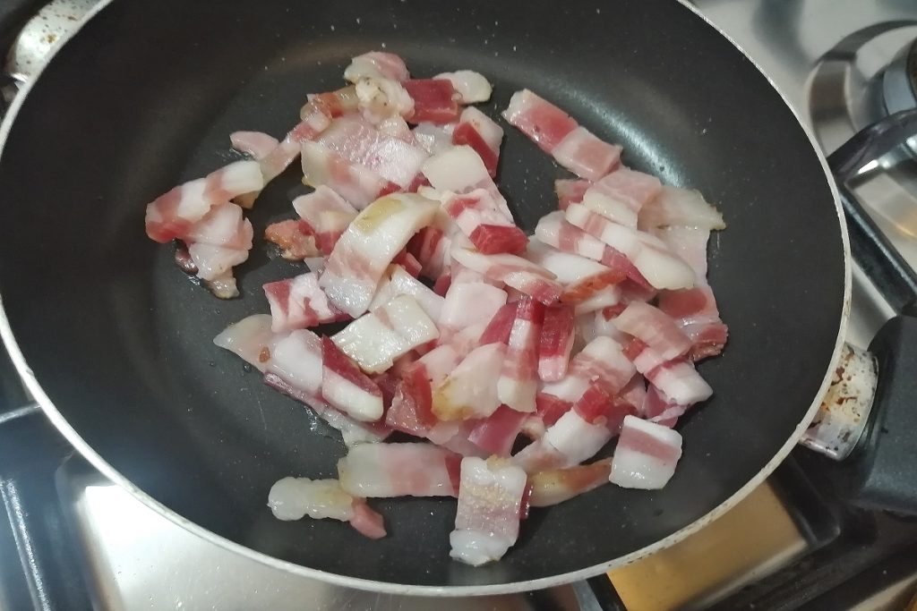 Em uma pequena frigideira colocamos o bacon cortado para dourar sem óleo.