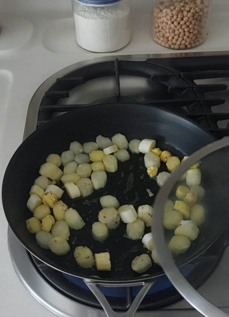 Lave, descasque e corte a cenoura em cubos. Cozinhe no vapor os ervilhas e a cenoura, com uma pitada de sal. Reserve.