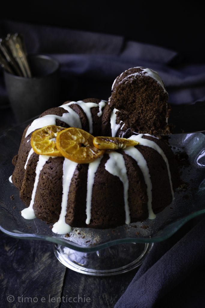 Um doce que derrete na boca, o bundt cake chocolate e cítricos, com farofa de amêndoas, para saborear por exemplo com sorvete de mandarino.