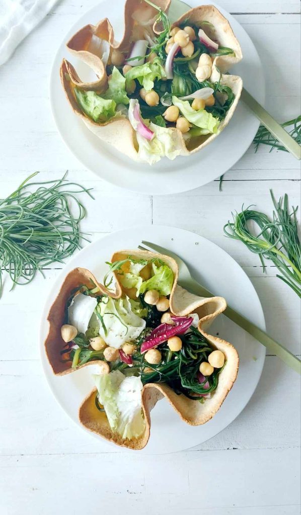 São um prato único completo os cestinhos de salada com agretti, completados com grão-de-bico, avelãs e ervas aromáticas.