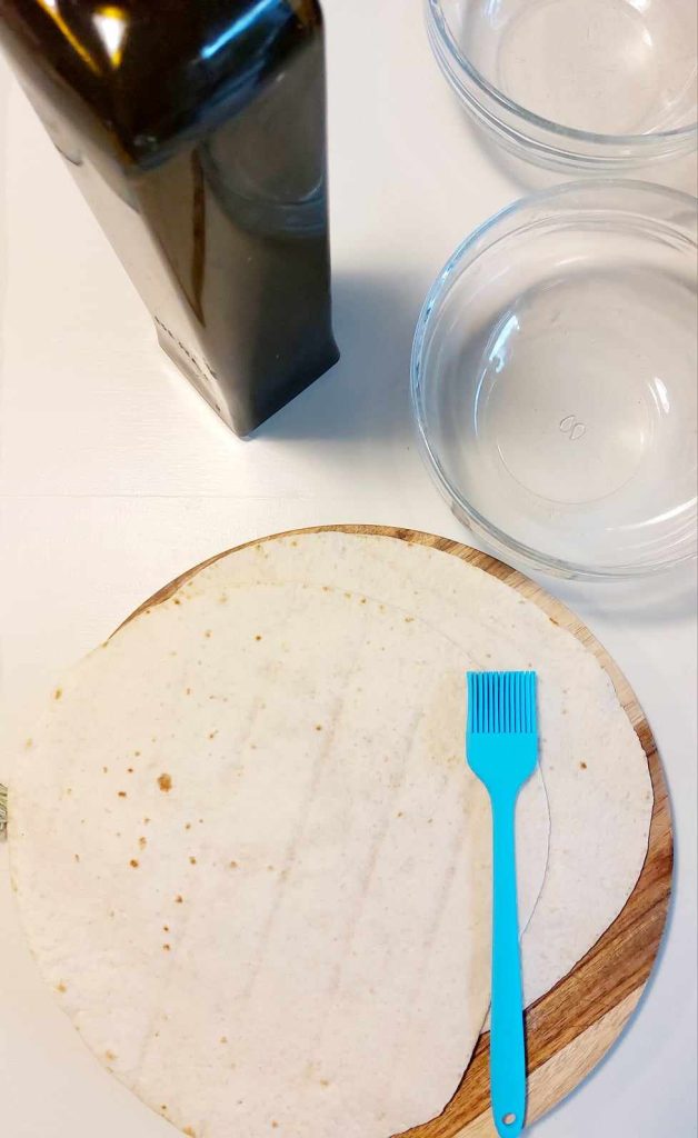 Fure as piadinas com os dentes de um garfo e pincele com azeite extravirgem de oliva. Pincele também as taças que possam conter as piadinas como um cestinho. Coloque na fritadeira a ar por 10 minutos a 180 graus ou no forno normal pelo mesmo tempo até que fiquem crocantes. Deixe esfriar.