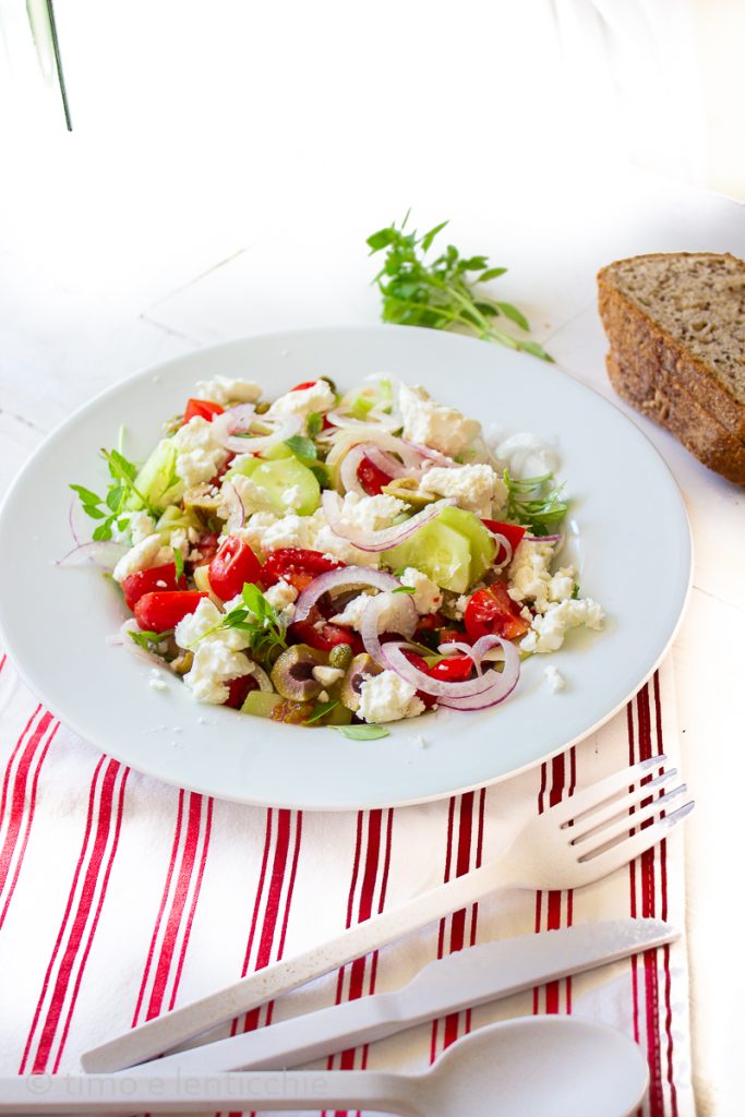 O feta deveria ser adicionado em blocos na salada grega, mas mesmo esfarelado tem seu porquê. Aqui está então a minha variação, com manjericão grego, feta esfarelada, azeitonas taggiasca e alcaparras e cebolas de Tropea. Uma salada grega preparada também com produtos bem italianos.